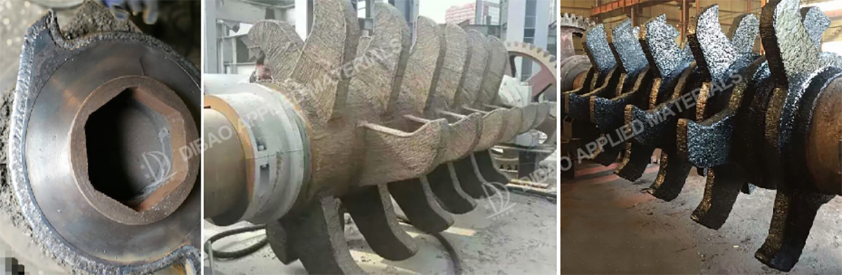 DB-969 | Self shield or gas protection or submerged arc | Mixed gas/neutral flux | 1.6,2.0,2.4,2.8,3.2 | C,Mn,Si,Cr,Mo | 55-59 | The weld metal is a self-hardening martensitic structure. It can withstand high stress wear and viscous wear. Suitable for wear between metal and metal or between metal and sand. | Dredging the cutter, stirring the spiral leaves, farming tools, crushers, etc. |